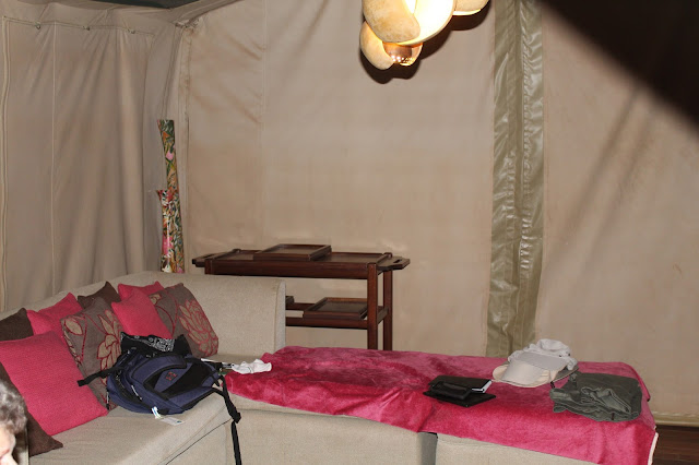 Here is the "front door" also know as the "flap""of our living room. The unique detail of this camp was that it had many small monkeys that roamed all areas. One came inside our tent when we were getting dressed. Sylvia stomped her foot and it ran away. Anytime the flap was closed, all three zippers, (bottom left, bottom right, & middle) had to be fastened in a wire clip that was protected from being opened by a spring. Otherwise, the monkeys could open it giving them access to the room.